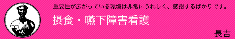 摂食嚥下障害には誤嚥・窒息、低栄養、脱水、食べる楽しみの喪失といったリスクが生じます。これらのリスクを考慮し介入する為には決して一人ではできません。多職種の協力や病棟スタッフの関わりがあり、食べられるようになった方や、退院後も経口摂取が出来ているといった情報を聞くとやりがいを感じずにはいられません。また、どうしたら自分の手で食べられるようになるのか、何が食べやすいかといったスタッフ間の会話を聞く事も増え、「食べる」ことの重要性が広がっている環境は非常にうれしく、感謝するばかりです。