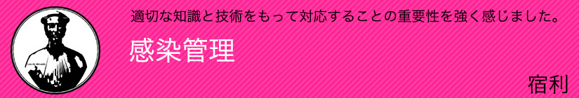 新型コロナウイルス感染症の流行当初、病院では最前線で感染症対応が求められる中で、医療従事者として適切な知識と技術をもって対応することの重要性を強く感じました。また病院では新型コロナウイルス感染症以外にも薬剤耐性菌や様々な病原体による感染が常に懸念されるため、患者さんや職員が安心して病院で過ごすことができるように尽力したいと改めて思いました。