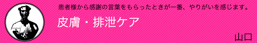 皮膚・排泄ケア認定看護師は、褥瘡などの治りにくい創傷・ストーマケア・失禁ケアなどを主に専門としています。その中でも私は褥瘡管理者として院内の褥瘡予防、褥瘡保有者の褥瘡の改善に努めています。